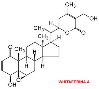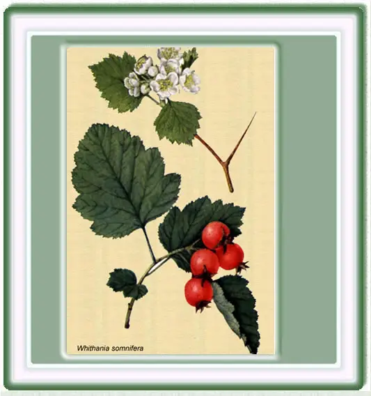 Las partes de la planta que se utilizan son fundamentalmente la raíz y a veces las hojas y las semillas. Las frutas tienen un efecto emético. Tiene las mismas aplicaciones que el Ginseng, aunque es menos estimulante y mas suave que este. Historicamente, esta planta ha sido utilizada como afrodisiaco, tónico hepático, anti-inflamatorio y astringente y, más recientemente para tratar bronquitis, asma, insomnio y demencia senil. Varios estudios clínicos y numerosas investigaciones en animales spoyan la eficacia de la Whitania en la ansiedad, desórdenes cognitivos y neurológicos, inflamación y enfermedad de Parkinson Esta planta contiene flavonoides, lactonas esteroides y alcaloides. Las lactonas esteroides han recibido el nombre de whitanoloides. Se cree que los dos componentes más importantes de esta planta son la whitaferina A (*) y el withanólido D. Las raíces de Whitania somnífera presentan mas de treinta whitanoloides y veinte alcaloides. Esta planta es una de las que más investigaciones se han realizado, tanto desde el punto de vista de su actividad farmacológica, como desde el punto de vista clínico. Su utiliza para tratar el estrés, la fatiga, la falta de concentración, la ansiedad, y el insomnio. Tambien se le atribuyen propiedades afrodisíacas y se ha utilizado con éxito para tratar la infertilidad másculina, habiéndose comprobado que mejora la espermatogénesis. En el tratamiento de la ansiedad es tan efectivo como la psicoterapia. La raíces de la Withania somnifera han mostrado poseer propiedades anti-inflamatorias, antitumoraless, antioxidantes, inmunomodulatorias, hematopoiéticas y rejuvenecedoras y