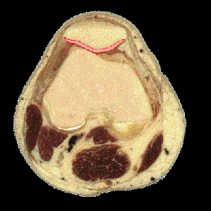 CARTILAGO ROTULIANODescripción: La parte posterior de la rótula está recubierta por la capa más gruesa de cartílago hialino que existe en el cuerpo. Origen: Las tres cuartas partes superiores de la rótula están cubiertas por cartílago hialino de 5 a 6 mm de grueso. La cuarta parte inferior de la rótula es superficie no-articular y no está recubierta por cartílago. Función: Amortiguación de los choques producidos durante las flexiones. El reblandecimiento del cartílago rotuliano (condromalacia rotuliana) es una cause frecuente del dolor de rodilla.