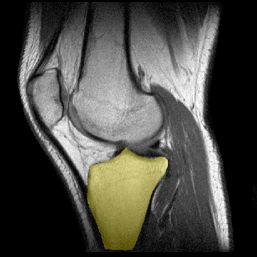 Inserción: Los tubérculos tibiales sirven de puntos de anclaje del ligamento patelar. El tubérculo de Gerdy, sobre la superficie anterolateral de la tibia proximal sirve para la inserción del tracto iliotibial. Además, los tendones sartorius, gracilis y semitendinoso -los tendones del pes anserinus -- se insertan en la tibia anteromedial proximal tibia. El tendón semimenranoso se inserta en el margen posteromedial de la tibia proximal. |