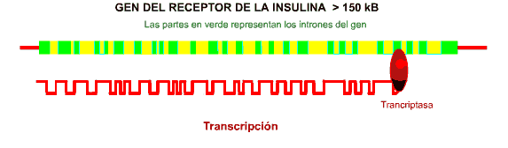 Pulse la imagen para ver una animación (29 Kb) La transcripción origina varios m-ARN de un tamaño superior en 1.5-5.3 Kbases que el correspondiente ADN complementario que codifica el receptor. Mediante cortes y empalmes adecuados (al menos se conocen 2 tipos de sitios de corte) se obtiene un m-ARN maduro. La translación de este origina un polipéptido de unos 160kDa. Este "proreceptor" contiene un péptido señal por el que se rompe para dar un péptido monocatenario correspondiente a la subunidad a en el NH2 terminal mientras que al COOH-terminal correspondiente a la subunidad b. Las subunidades se separan para posteriormente unirse una subunidad a y una b y luego, cada uno los fragmentos entre sí para ocadionar el receptor. No se conocen bien todos los pasos que conducen a la producción del receptor maduro a2b2que se insertará posteriormente en la membrana celular.