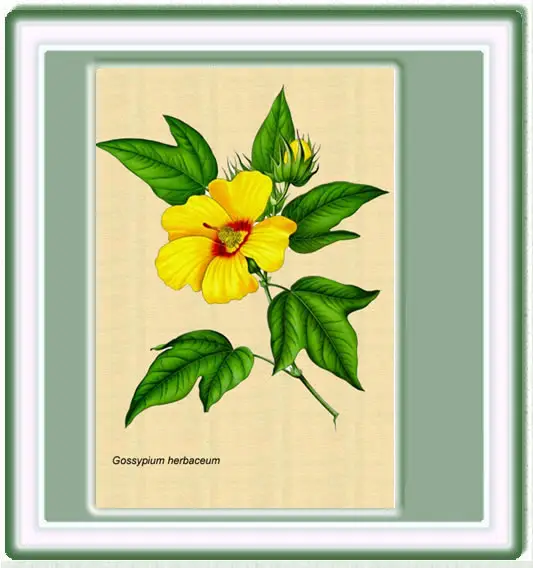 La raíz principal es axonomorfa o pivotante, mientras que las raíces secundarias siguen una dirección más o menos horizontal. El tallo es erecto y con ramificación regular. Existen dos tipos de ramas, las vegetativas y las fructíferas. Las hojas son pecioladas, de un color verde intenso, grandes y con los márgenes lobulados. Están provistas de brácteas. Las flores son dialipétalas, grandes, solitarias y penduladas. El cáliz de la flor está protegido por tres brácteas. La corola está formada por un haz de estambres que rodean el pistilo. El fruto es una cápsula en forma ovoide. con tres a cinco carpelos, que tiene seis a diez semillas cada uno. Las células epidérmicas de las semillas constituyen la fibra llamada algodón. La longitud de la fibra varía entre 20 y 45 cm, y el calibre, entre 15 y 25 micras. El algodón utilizado en enfermería y médicina es insípido, incoloro, insoluble en alcohol, agua, éter, aceites y ácidos débiles. Se compone casi exclusivamente de celulosa. Los álcalis concentrados lo disuelven en caliente. También es soluble en una solución de sulfato amónico-cúprico. Los ácidos fuertes como el ácido sulfurico o el nítrico lo disuelven, en este último caso para formar el algodón pólvora (un explosivo). Externamente, el algodón se utiliza para la aplicación de diversos medicamentos sobre las erisipelas, eritemas, quemaduras recientes, heridas y contusiones. En el caso de las quemaduras y de las heridas, se deben tomar precauciones para que el algodón no se endurezca y seque, ya que podría ocasionar irritación. Es insustituible para extraer la sangre y otros fluídos durante la cirugía, siendo a menudo impregnado con ácido boránico u otros antisépticos. También forma parte de los pesarios, tampones y compresas. De las semillas del algogón se extrae un aceite que contiene una sustancia tóxica, el gosipol (*) que se puede eliminar resultando un aceite comestible, pero poco utilizado por ser el balance omega3/omega6 muy desfavorable. El gosipol ha sido propuesto como insecticida, contraceptivo masculino y también para el tratamiento del herpes genital Las hojas y flores del algodonero son emolientes y, en algunas partes como en Brasil, se usan en infusión para el tratamiiento de las irritaciones pulmonares o en la disentería. La raíz tiene propiedades diuréticas. |