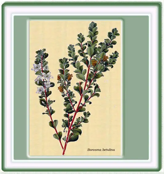 La Barosma betulina es un arbusto de la familia de las Rutáceas, con hojas de color verde pálido muy pequeñas y terminadas en un pincho, con múltiples glándulas oleosas distribuidas la misma. Como la planta se arranca entera para su aprovechamiento, muchas veces se encuentran pequeñas flores blancas de 5 pétalos y frutos pardos redondeados mezclados con las hojas. Estas tienen un olor parecido a la menta y su sabor fuertemente aromático. Los principales componentes de las hojas de Buchui son un aceite volátil. mucílagos y diosfenol, este último con propiedades antisépticas. Se le han reconocido propiedades diuréticas, antiepticas y antiinflamatorias de los órganos genitourinarios, especialmente de la vejiga de la orina y de la próstata El buchu se utiliza en las pielonefritis, cistitis y uretritis. Resulta eficaz, tanto tomada en infusión, como aplicada en lavados uretrales. |