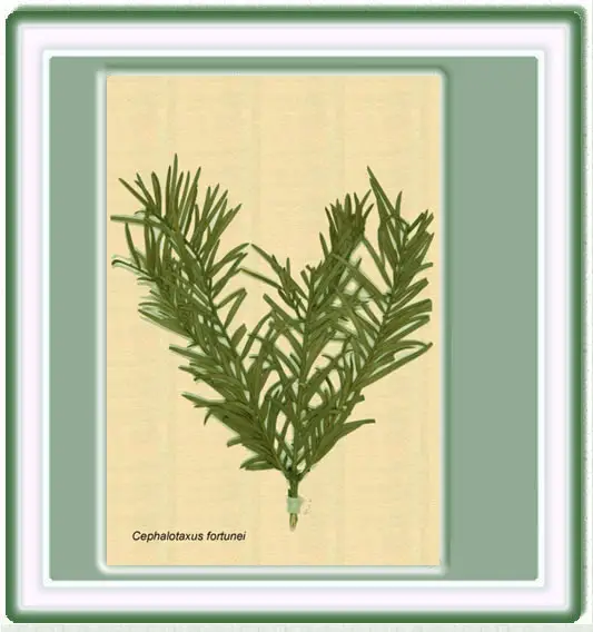 cefalotaxáceas, originario de China central. Tiene una altura de 6 y 12 m. Las hojas son lineales, dísticas, acuminadas, con 2 bandas argénteas en el envés, discoloras, coriáceas. Los frutos, comestibles son conos ovoides, de 2,5 cm de largo por 1,5 cm de diámetro. Maduración anual