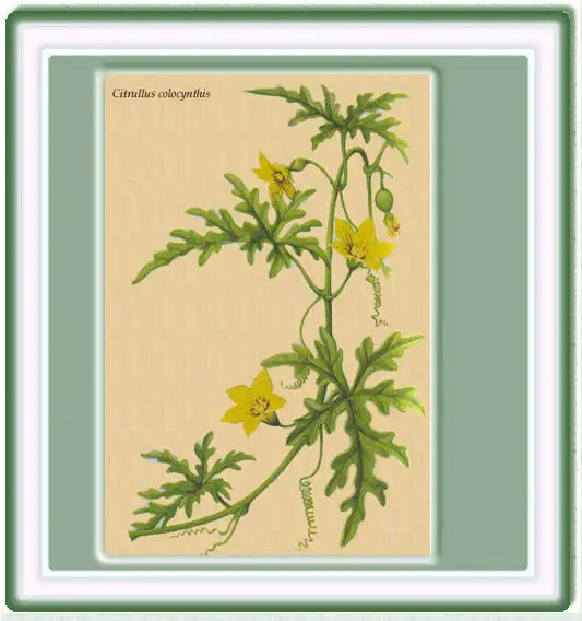 La pulpa contiene un glucósido tóxico, la coloquintina (*) , un sustancia resinosa insoluble en éter, un aceite esencial y pectinas. Las sustancias venenosas no se encuentran en las semillas sino en la pulpa, aunque también se han encontrado saponinas venenosas en las raíces. Los síntomas de envenenamiento son fuertes retortijones abdominales y diarrea que puede llegar a ser sanguinolenta. Dosis de tan solo 2 cucharadas del polvo de la pulpa seca pueden producir la muerte. Se utiliza como catártico, si bien en combinación con otras plantas. La inhalación del polvo de coloquíntida es fuertemente irritante produciendo un intenso dolor en las fosas nasales. La infusión coloquintina se utiliza tradicionalmente en algunos países mediterráneos como antidiabético y, efectivamente, recientes investigaciones han puesto de manifiesto que esta planta tiene propiedades insulinotrópicas y que reduce la hiperglucemia en algunos modelos de animales diabéticos. Las curcubitacinas, p.ej. la coloquintina, ha despertado el ínterés de los oncológos por sus propiedades antitumorales |