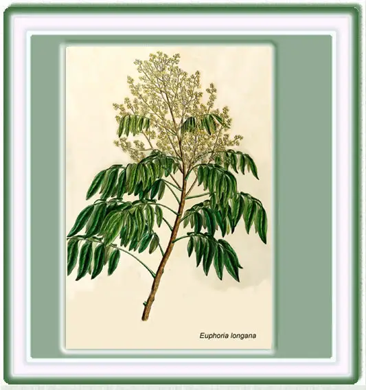 El árbol de la longana es elegante, erecto, de 9 - 12 m de altura y 14 m de ancho, con la corteza rugosa en el tronco y largas ramas difundidas, ligeramente caídas, y con follaje denso. Las hojas son perennes, alternas, paripinnadas opuestas, elípticas, ovado - oblongas o lanceoladas, coriáceas, onduladas, de color verde brillante en la superficie superior, mínimamente peludas y de color verde grisáceo por debajo. Las flores de color amarillo pálido, con 5 a 6 pétalos, de tallo pubescente son más grandes que las del lichi, nacen en panículas terminales dirigidas hacia arriba, mezcladas las masculinas y las femeninas. Los frutos, en racimos colgantes, son globosos, con la corteza fina, frágil, de color amarillo-marrón rojizo o marrón claro, más o menos granulada, con las protuberancias mucho menores que las del lichi. La pulpa es mucilaginosa, blanquecina, translúcida, algo almizclada, dulce, pero no tan dulce como la del lichi y con menos "bouquet". La semilla es redonda, de color negro azabache, brillante, con una mancha blanca circular en la base, dándole el aspecto de un ojo.