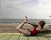- flexionar las piernas a la altura de la rodillas hasta alcanzar tobillos con las manos. Mantener el estómago contra el suelo