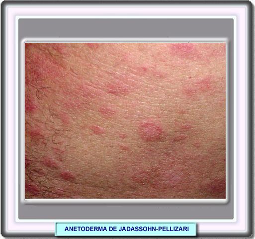 También llamada anetodermia eritematosa, puede ir precedida de una fase eritematosa, a veces papulosa, con formación de elementos numulares con aspecto plisado. A la palpación, el dedo se hunde en una especie de agujero blando netamente delimitado por un anillo resistente formado por la dermis cercana La anetodermia debe distinguirse de otras formas de pérdida de sustancia localizada o de protrusiones circunscritas de la piel. Algunas condiciones atróficas son las cicatrices, el lupus eritematoso discoide y el liquen escleroso y atrófico. Otros condiciones que deben incluirse en el diagnóstico diferencial son:
