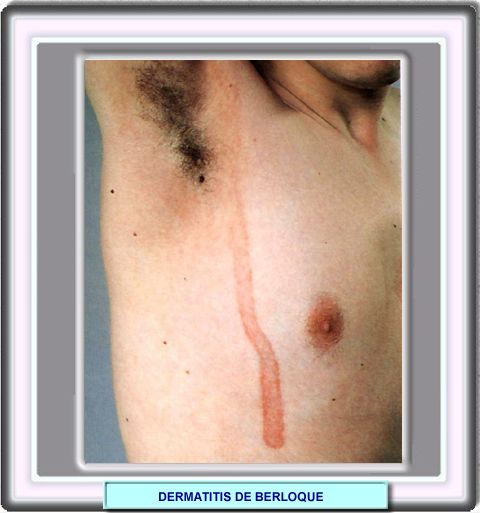 La dermatitis Berloque es una condición de la piel en la que el paciente desarrolla una coloración pardo-rojiza en las manos, cuello y otras áreas al aplicar una colonia o perfume. Se debe a la capacidad de algunas furanocumarinas de absorber radiación ultravioleta liberándola después de forma concentrada sobre la piel. Estos compuestos, de los cuales el más conocido es el bergapten, se encuentran presentes en la esencia de bergamota, limón y naranja y algunas otras que se usan en perfumería. Típicamente, las lesiones tienen la forma de goterones y siguen exactamente el trayecto del líquido sobre la piel. Desde la introducción de esencia de bergamota sintética en perfumería, la incidencia de dermatitis berloque se ha reducido drásticamente |