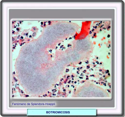 La enfermedad se caracteriza por la formación microscópica de gránulos eosinofílicos que se asemejan a los observados en infecciones por especies de Actinomyces Macroscópicamente, los gránulos de botriomicosis son blanco-amarillentos, con un diámetro de 1-3 mm, pareciéndose a microabscesos rodeados de pus. El examen histopatológico muestra los gránulos botriomicóticos rodeados por un anillo acidofílico prominente (fénomeno de Splendore-Hoeppli). La tinción de gram demuestra la presencia de microcolonias de cocos gram-positivos y de bacilos gram-negativos en el gránulo. Los gérmenes encontrados con mayor frecuencia son S. aureus, E. coli, P. aeruginosa, Corynebacterium jeikeium, y Fusobacterium nucleatum |