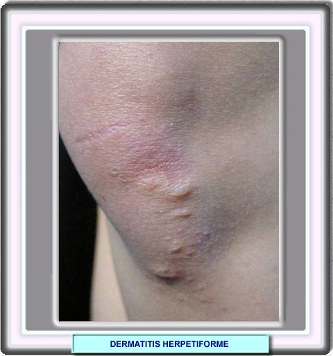 Tratamiento El tratamiento principal es una dieta libre de gluten que hace desaparecer tanto las alteraciones intestinales como las cutáneas. El tiempo de respuesta a la dieta sin gluten es, para los adultos, el mismo que el de la enfermedad celíaca. Por el contrario, los niños responden antes a los síntomas intestinales que a los cutáneos. La dapsona (1.5-2 mg/kg/dia en niños, 100-150 mg/dia en adultos) o la sulfapiridina (0.75-1.5 mg/kg en niños, 1-1.5 g/dia en adultos) reducen o eliminan rápidamente los síntomas a las 3 horas de su administración y evitan la aparición de nuevas erupciones. No siempre son necesarias dosis diarias de medicación y, en cualquier caso, las dosis deberán ser las menores posibles, debido a los posibles efectos adversos ( anemia hemolítica metahemoglobinemia, agranulocitosis, cefaleas, letargia, neuropatía periférica, etc) Sin embargo, pueden producirse recadías cuando se discontinua el tratamiento. Es importante tener en cuenta que los fármacos anti-inflamatorios no esteroídicos a menudo producen exacerbaciones, incluso en pacientes tratados con dapsona |