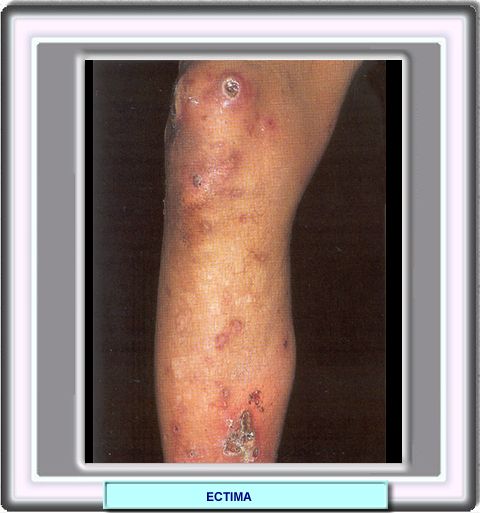 El ectima se desarrolla sobre todo en las extremidades inferiores de niños, personas con diabetes o ancianos mal atentidos. En los países cálidos durante el verano, las lesiones del ectima pueden evolucionar a úlceras en los tobillos o dorso de los pies Las lesiones del ectima muestra necrosis de la dermia e inflamación. Suele observarse un infiltrado granulomatosos perivascular junto a edema del endotelio. La depresión de la úlcera está cubierta por una densa costra. Raras veces esta enfermedad ocasiona complicaciones. Cuando ocurren, suelen ser invasiones estreptocócicas de la piel entre las que se incluyen la celulitis, erisipela, gangrena y linfadenitis supurativa