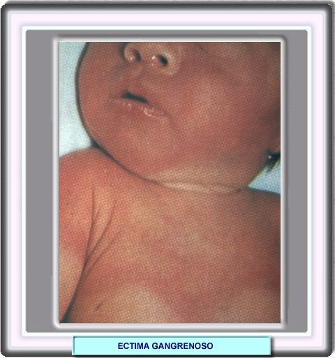 La sepsis producida por Pseudomonas aeruginosa tiene lugar, por lo general en niños con una condición subyacente, como malnutrición, quemaduras extensas o inmunodepresión. La enfermedad se manifiesta como maculas y petequias no demasiado específicas sobre las que se desarrollan posteriormente lesiones discretas en forma de nódulos y ampollas. Estas lesiones típicas de la sepsis por Pseudomonas son las que reciben el nombre de ectima gangrenosa. Pueden aparecer múltiples lesiones en diferentes partes del cuerpo y en un estado evolutivo diferente. Los cultivos de los frotis o aspirados dan positivo para los Pseudomonas. El tratamiento del ectima gangrenoso requiere el uso de las penicilinas con actividad antipeudomonas (piperacilina), fluoroquinolonas, cefalosporinas de tercera generación o aztreonam La enfermedad responde bien al tratamiento excepto si está muy extendida, la administraciòn de antibióticos se lleva a cabo muy tarde o el paciente muestra una grave neutropenia |