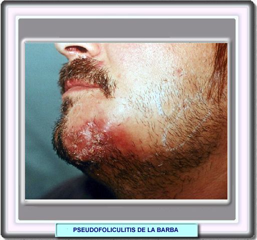 La pseudofoliculitis de la barba se caracteriza por múltiples pápulas en el área de la barba debidas al crecimiento hacia adentro de pelos curvos. Suele ser muy frecuente entre las personas de color que se afeitan. Si se observan pústulas, se debe descartar una infección por S. aureus |
