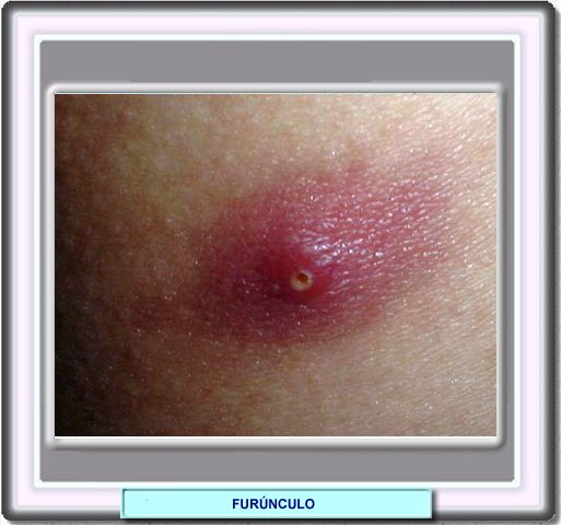 La lesión comienza por una foliculitis cuya base se torna roja, dolorosa, infiltrada, formándose una pústula centrada por un pelo sobre un nódulo inflamatorio con gran rojez y edema alrededor. Luego se abre, sale pus y el tejido amarillento del clavo, dejando una cavidad profunda que se cierra con rapidez, desapareciendo los signos de inflamación. Deja una cicatriz atrófica, deprimida y violácea. Los furúnculos pueden aparecer como una lesión solitaria o como múltiples lesiones. |