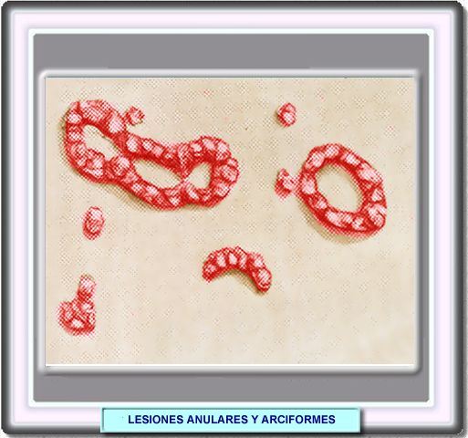 Una lesión anular puede ser el resultado de un proceso patológico en el que la lesión se extiende perifericamente sin afectar al centro. Las lesiones pueden ser circulares, numulares (con forma de moneda) o discoides, como ocurren en el eccema y el lupus eritematoso, respectivamente Las lesiones anulares pueden ser maculares o ligeramente elevadas como en el caso de eritema, erupciones inducidas por fármacos, micosis fungoides o lupus eritematoso. En la psoriasis, las pápulas a menudo siguen una disposición anular, policíclica o arciforme. La disposición serpigiforme de las lesiones es característica de las pápulas y nódulos de la sífilis y del lupus vulgar |