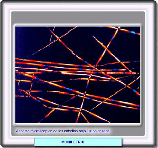 La microscopía con luz polarizada muestra el aspecto característico de los cabellos en el moniletrix