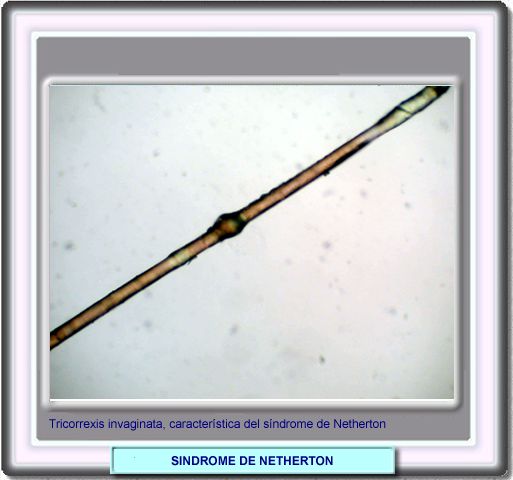 El síndrome de Netherton es una enfermedad genética, de caracter autosómico recesivo, debido a mutaciones en el gen SPINK5, que codifica el inhibidor de la serina-proteasa LEKTI. Este gen se encuentra en el cromosoma 5, locus 5q32 . La enfermedad se caracteriza por "cabellos bambú" (tricorrexis nodosa, o, debido a los nodos, tricorrexis invaginata), eritroderma ictiosiforme congénito y diátesis atópica. Se observa casi unicamente en las niñas. Otras afectaciones frecuentes de los cabellos son moniletrix, pili torti, pelo escaso y deslustrado y ausencia de pelo en las cejas y de pestañas. |