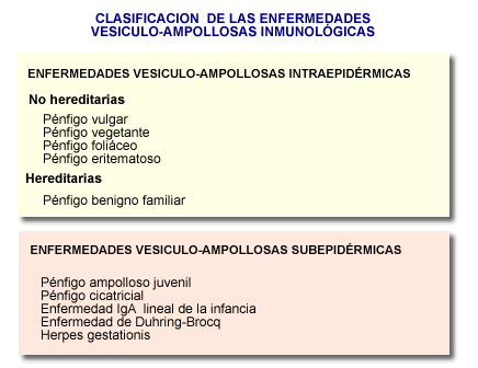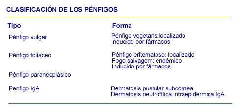 El pénfigo de clasifica en cuatro tipos: pénfigo vulgar, pénfigo foliáceo, pénfigo paraneoplásico y pénfigo IgA. Otros autores clasifican los procesos autoinmunes ampollosos en dos grupos según sea la localización de las vesículas ampollosas: las intraepidérmicas y subepidérmicas. |