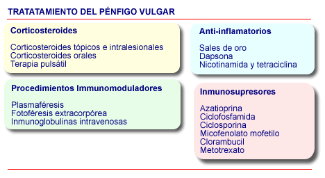 | En el caso del pénfigo foliáceo, dado que la enfermedad puede permanecer localizada durante muchos años, puede ser suficiente el tratamiento con corticoides tópicos. Cuando la enfermedad se extiende, el tratamiento es el mismo que el del pénfigo vulgar | |