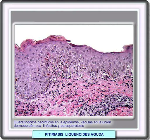 Los hallazgos histológicos en la pitiriasis liquenoide y varioliforme aguda y crónica comparten muchas características. Los cambios microscópicos están correlacionados con los estadios de las lesiones y la forma de la enfermedad. En las dos formar se observa una densa inflamación linfocítica con exocitosis de los linfocitos, paraqueratosis y espongiosis focal. La forma aguda muestra un infiltrado perivascular linfocítico y necrosis fibrinoide que le confiere el aspecto de una vasculitis linfocítica. En los infiltrados CD8 predominan en la dermis y epidermis de los pacientes con pitiriasis liquenoide y varioliforme aguda. |