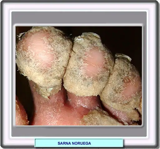 La sarna noruega ha sido tradicionalmente asociada a la edad avanzada, estados de debilidad e inmunosupresión. Son muy frecuentes lesiones hiperqueratósicas que originan costras de manera que la enfermedad puede asemejarse a una psoriasis. En las uñas de los dedos de las manos y pies, la enfermedad puede simular la psoriasis o una onicomicosis. Se encuentran cientos o miles de parásitos en las escamas y en las uñas. Entre el 2 y el 4% de los pacientes con SIDA desarrollan sarna, siendo los tipos más frecuentes la sarna noruega y la escabiosis nodular Raras veces la sarna afecta el cuero cabelludo, pero cuando lo hace puede simular una dermatitis seborreica. Suele ser más frecuente en los niños y ancianos La sarna no causa fiebre a menos que haya una sobreinfección añadida |