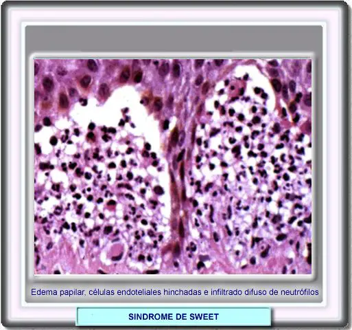 Desde el punto de vista histológico, el síndrome de Sweet se caracteriza por papilas dérmicas y densos infiltrados de neutrófilos en la dermis. Estos infiltrados suelen ser difusos con inclusiones de eosinófilos y linfocitos. Son comunes núcleos fragmentados de neutrófilos (leucocitoclasia o cariorrexis) lo que puede ser confundido a baja resolución con vasculitis. Usualmente, la epidermis es normal. La microscopía electrónica no revela daño celular sino más bien signos de una gran actividad metabólica evidenciada por la presencia de numerosas mitocondrias, areas de Golgi y retículos endoplásmicos