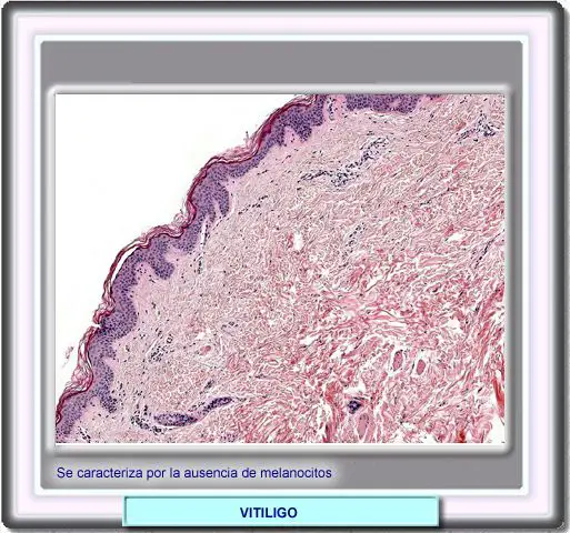 Histológicamente se caracteriza por la ausencia de melanocitos, aunque recientemente se ha comunicado que en los vitiligos crónicos los melanocitos pueden no estar ausentes. En el vitiligo tricrómico, el número de melacitos menor en las manchas café con leche que en la piel normal y menor en las manchas blancas que en las café con leche indican una progresión centrífuga de la enfermedad. Se han observado variaciones en el número de células de Langerhans en las máculas de vitiligo, así como alteraciones funcionales. |