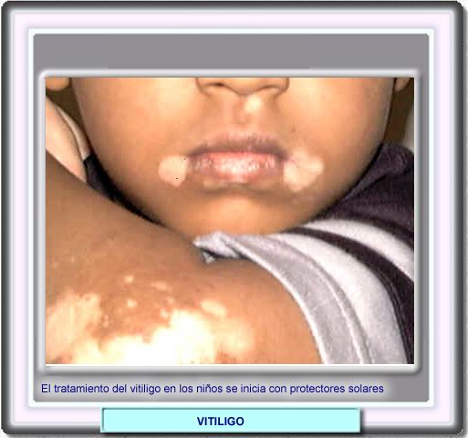 El tratamiento del vitiligo en los niños se inicia con protectores solares y prendas de protección. El siguiente paso es la aplicación de de esteroides tópicos y, ocasionalmente de psoralenos tópicos. En los niños mayores de 6 años, el tratamiento de elección es la irradiación con UVB. lLos psoralenos por via oral pueden ser considerados a partir de los 10 años, cuando se supone que las lentes ya han madurado. |