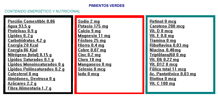 | Los pimientos asados, crudos o en el microondas constituyen un alimento excelente por su bajo contenido en calorías y su riqueza en vitaminas. Pueden consumirse sin problemas, si bien si se preparan fritos, su contenido calórico de multiplica pasando de 20 calorias/100 gramos a 150 calorías o más. |