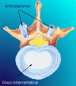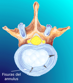 La figura muestra un segmento espinal compuesto por dos vértebras, el disco intervertebral y las raíces de los nervios espinales. CAUSAS Una gran parte de los problemas que causan el dolor de espalda son el resultado de lesiones y degeneraciones de los discos intervertebrales. Las lesiones se deben al estrés continuo al que están sometidos los discos intervertebrales que actúan a modo de amortiguadores durante la marcha y el movimiento, mientras que la degeneración se debe a un proceso de envejecimiento que hace que se originen fisuras y grietas en los mismos. Los primeros cambios que se observan en los discos son fisuras que se producen en el annulus. Estas fisuras cicatrizan de igual forma que en otros ligamentos creándose un tejido cicatrizal menos resistente y flexible que el que el original. A medida que se van repitendo estas lesiones, la degeneración va progresando, el disco va perdiendo parte de su contenido en agua, disminuyendo su capacidad de amortiguar impactos, terminando finalmente por colapsarse. Como consecuencia, se producen contactos entre las vértebras y pequeñas lesiones óseas que se traducen en rebabas que sobresalen hacia afuera y que entran en los espacios donde se encuentran las raíces nerviosas o canal espinal comprimiendo éstas. El resultado final es del dolor Una de las consecuencias más graves de la degeración del disco es la hernia. Esta tiene lugar cuando se produce una fisura del annulus que permite que parte del nucleus pulposus pase al canal espinal y comprima las raíces nerviosas. La hernia de disco produce dolor, entumecimiento y debilidad en las zonas administradas por este nervio. |