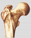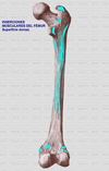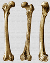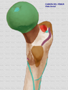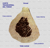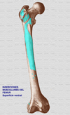 El fémur es el único hueso del muslo, siendo por lo demás, el más largo del cuerpo. Es un hueso largo, par y simétrico que se divide a efectos anatómicos en tres partes: el cuerpo, el extremo superior o cabeza y el extremo inferior. El cuerpo del fémur es más o menos triangular (*) , pudiéndose considerar tres caras, una anterior y dos laterales, así como tres bordes. Las caras interna y externa son lisas y convexas y éstan cubiertas en su mayor parte por el cuádriceps pero sólo el músculo crural se inserta parcialmente en ellas. La cara anterior, también lisa, presta inserción a la músculo cuadriceps, al musculo crural y al músculo subcrural. Cuando se observa el fémur por la superficie dorsal se aprecia un borde o cresta, llamada línea áspera, que se extiende desde el trocánter menor hasta los dos tercios del cuerpo del fémur. En ese punto, la línea áspera se bifurca en dos ramas que, en su parte inferior forman el espacio poplíteo. Por su parte superior, la línea áspera se trifurca originando una área triangular, la tuberosidad glútea, con tres crestas rugosas : el borde lateral rugoso de la tuberosidad glútea se denomina cresta glútea, sirviendo de inserción para el músculo glúteo. La rama media presta inserción al músculo pectino y se denomina cresta pectínea. El borde lateral, menos rugoso, se denomina cresta del vasto. En el vértice inferior de la tuberosidad glútea se encuentra el agujero nutricio que dá paso a los vasos que irrigan el hueso. La parte superior del fémur se divide, a efectos anatómicos en cinco partes: cabeza, trocánter mayor y menor, cuello del fémur anatómico y cuello del fémur quirúrgico La cabeza del fémur tiene una forma semi-esférica, con una superficia lisa que se articula con la cadera en el acetábulo (*) . En su parte media se observa una depresión, la fóvea (*) , en la que se inserta el ligamento redondo (ligamentum teres). El cuello del fémur une la cabeza con los dos trocánteres: su eje mayor lleva una dirección oblicua de arriba a abajo y de dentro a fuera. La superficie del cuello femoral se caracteriza por ser muy rugosa y por la presencia de numerosos orificios vasculares. Cuando se observa la superficie ventral entre los dos trocánteres se vé una cresta rugosa denominada línea intertrocantérica, mientras que en la parte posterior de la unión del cuello con la caña del femur se extiende la cresta intertrocantérica. La línea espiral (*) es la continuación de la línea intertrocantérica y se situa por debajo de la línea áspera. Lateralmente, limita con la tuberosidad glútea En la parte inferior del fémur (o epífisis distal) se observan dos protuberancias, los cóndilos lateral y medial. En la cara anterior ambos cóndilos confluyen y muestran una superficie lisa. En la cara posterior, los cóndilos están separados por un surco profundo, la fosa intercondílea. Por encima se extiende un espacio triangular, el espacio poplíteo, ambos cóndilos, la superficie lisa está recubierta de cartílago hialino, siendo superficies articulares que articulan con las caras medial y lateral de la tibia. Finalmente, el cuello quirúgico es la porción del fémur que une el cuerpo del hueso a su extremo superior, correpondiente a la zona inmediatamente por debajo de los trocánteres. En el fémur se inserta un gran número de músculos que controlan los movimientos de la cadera, pelvis y piernas. En los trocánteres se insertan los músculos obturador interno, músculos géminos, músculo obturador interno, glúteos mediano y menor, músculo piramidal y músculo cuadrado crural. En la parte superior del cuerpo del fémur tienen su inserción los tres músculos vastos, el psoas ilíaco, el músculo glúteo mayor, el músculo pectíneo y los músculos aductores mayor y menor. Ya en la parte central del cuerpo de fémur se encuentran las insercaciones del aductor mediano, del bíceps femoral y las tres inserciones del músculo tensor de la sinovial de la rodilla. Finalmente, el apófisis distal se encuentran las inserciones de los músculos gemelos, del músculo poplíteo, del musculo plantar largo y del aductor mayor. |