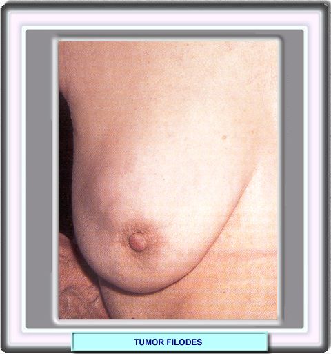 Los tumores filodes se definen como tumores circunscritos bifásicos, básicamente análogos a los fibroadenomas, caracterizados por un componente epitelial organizado en una capa doble que bordea una serie de hendiduras rodeadas de un componente mesenquimatoso hipercelular, con un aspecto similar al de las hojas de los árboles. Descritos en 1883 por Johannes Mueller como citosarcoma filodes (del griego phyllos = hojas), hoy día se prefiere el nombre de tumor filodes por no ser siempre malignos. Los tumores filodes son relativamente poco frecuentes suponiendo entre el 0.3-0.5% de todos los tumores de mama. Se presentan con mayor frecuencia entre los 35 y 55 años. Usualmente, es unilateral. Cuando son de tamaño pequeño, los tumores filodes son asintomáticos. Al crecer, si el tumor no es demasiado profundo puede alterar el contorno de la mama, mostrándose como un bulto lobulado. Cuando es profundo puede afectar el tamaño de la mama produciendo dolor a la paciente. |