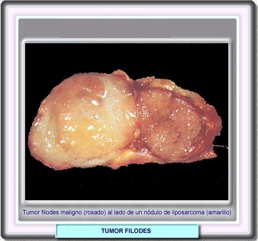 En algunos casos, aparecen formaciones quísticas dentro del tumor filodes que muestran un aspecto lobulado. Los tumores filodes se clasifican en benignos, fronterizos ("borderline") o malignos a partir de sus características histopatológicas. Macroscópicamente, los tumores filodes de cualquier tipo tienen una superficie lisa, con un color rosado o grisáceo. Se diferencian de los fibroadenomas en que carecen de una cápsula, tienen un aspecto carnoso y una menor consistencia. Además, la superficie del tumor filodes está más o menos lobulada. Se cree que los tumores filodes derivan del estroma intralobular o periductal. Se pueden desarrollar de novo o a partir de fibroademomas. En algunos casos, se encuentran fibrodenomas adyacentes al tumor
