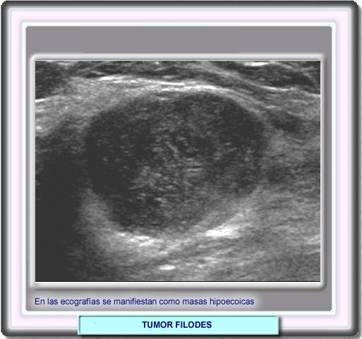 La ecografía muestra nódulos o masas hipoecoicas con contornos delimitados. Ocasionalmente pueden observarse espacios quísticos. En la mayor parte de los casos, los tumores filodes de asemejan a los fibroadenomas