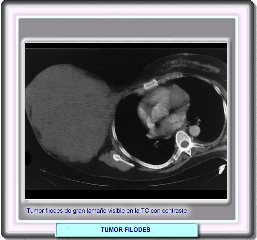 Aunque no se utiliza a menudo por sus elevados costes y las molestias que representa para la paciente, la TC muestra los tumores filodes como masas homogéneas bien delimitadas como en este caso, en el que el tumor ha alcanzado un tamaño > 30 cm.