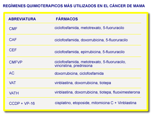 El régimen quimioterápico más utilizado es el CMF (ciclofosfamida, metotrexato, 5-fluoruracilo). Inicialmente esta combinación fué utilizada en forma de administración continua añadiendo vincristina y prednisona. Sin embargo, fué modificada posteriormente y se prefiere una administración i.v. de metotrexato y 5-fluoruracilo los días 1 y 8, la ciclofosfamida oral los días 1 y 14, con 14 días de descanso en un ciclo de 28 días. La duración de este tratamiento no suele exceder de los 6 meses, siendo el óptimo entre 4 y 6 meses. |