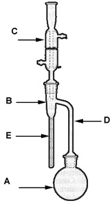 Where the specimen is an insoluble solid, the water may be extracted using a suitable anhydrous solvent from which an appropriate quantity, accurately weighed, may be injected into the anolyte solution. Alternatively an evaporation technique may be used. Procedure- Quickly inject the Test Preparation, or transfer the solid sample, into the anolyte, mix, and perform the coulometric titration to the electrometric endpoint. Read the water content of the Test Preparation directly from the instrument display, and calculate the percentage that is present in the substance. METHOD II (AZEOTROPIC-TOLUENE, DISTILLATION) Apparatus- Use a 500-mL glass flask A connected by means of a trap B to a reflux condenser C by ground glass joints (see figure). The critical dimensions of the parts of the apparatus are as follows. The connecting tube D is 9 to 11 mm in internal diameter. The trap is 235 to 240 mm in length. The condenser is of the straight-tube type, is approximately 400 mm in lenght and not less than 8 mm in bore diameter. The receiving tube E has a 5-mL capacity, and its cylindrical portion, 146 to 156 mm in length, is graduated in 0.1-mL subdivisions, so that the error of reading is not greater than 0.05 mL for any indicated volume. The source of heat is preferably an electric heater with rheostat control or an oil bath. The upper portion of the flask and the connecting tube may be insulated. Clean the receiving tube and the