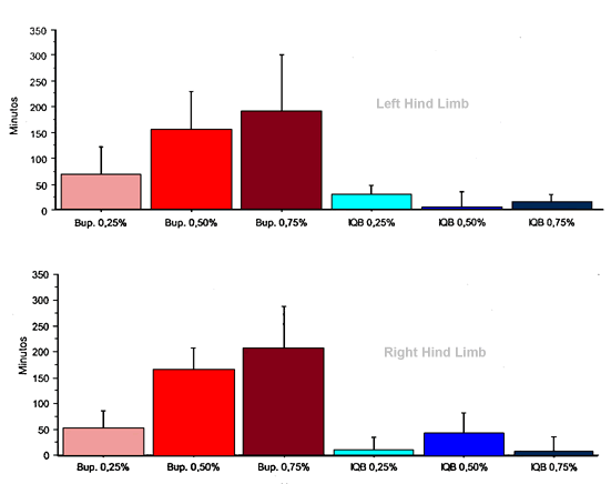 Figure 4. Differences in the duration of sensory blockade vs motor blockade. The values (in minutes) represent still present motor blockade after cessation of analgesia in the left hind and right hind limbs (Mean ± SE, n= 6)
