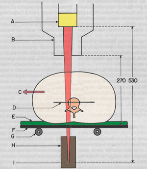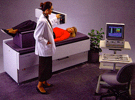 Esta técnica consiste en irradiar con dos fuentes radioactivas de longitud de onda distinta, el Am241 y el Cs137, el cuerpo del paciente, recogiendo en un contador escintilométrico las dos radiaciones que han atravesado el hueso. El cálculo integrado de las lecturas escintolométricas permite obtener de una forma indirecta, la densidad ósea. El cuerpo se puede mover en un carro sobre ruedas para irradiar diferentes huesos |