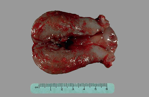 Este útero es de tamaño normal pero muestra una masa irregular en la parte superior del fundus que mostró ser tumoral en la biosia La microfotografía muestra un adenocarcinoma endometrial moderadamente differentiado, ya que se discierne claramente la estructura glandular |