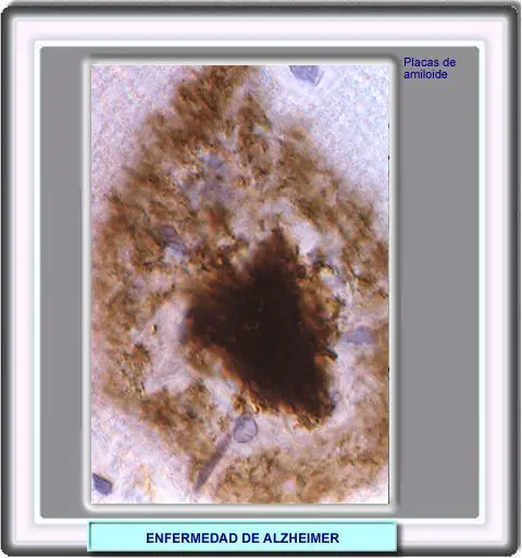 Imagen ampliada de las placas de amiloide Las placas de amiloide tienen típicamente un tamaño de 100 a 200 mm de diámetro. Microscópicamente, se observan cuerpos densos, poliformos, vesículas y mitocondrias anormales, así como acumulaciones de filamentos plegados helicoidalmente y de filamentos rectos |