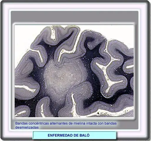 Las lesiones consisten en bandas concéntricas desmielinizadas, separadas por áreas con la mielina intacta. Clínicamente, la enfermedad se caracteriza por disfunción de los hemisferios cerebrales. aumento de la presión intraneal, cefaleas, convulsiones, afasia, estado de la consciencia alterado y deterioro de la función mental . El tratamiento es el mismo que en el caso de la esclerosis múltiple: corticoides, plasmaferesis e inmunosupresión |