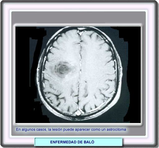 Se han descrito casos en los que las lesiones de la enfermedad de Baló son indistinguibles de un astrocitoma de grado bajo. En estos casos, el diagnóstico sobre puede establecerse anatomopatólicamente después de una biopsia estereotáctica