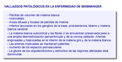 Las anormalidades patológicas observadas en la necropsia de los pacientes con enfermedad de Binswanger se encuentran localizadas en toda la materia blanca de los hemisferios cerebrales y cereberales y en las arterias y arteriolas que riegan el cerebro. La superficie externa del cerebro permanece normal. Las alteraciones son más evidentes en las regiones periventriculares y, a menudo son evidentes múltiples infartos lacunares presentes en los ganglios de la base, el tálamo, la protuberancia y la materia blanca cerebral. La pérdida de mielina es extensa, en particular en las regiones periventriculares respetando las fibras en U de las circunvoluciones más profundas, las radiaciones ópticas y las cápsulas interna y externa. El cuerpo calloso se mantiene normal aunque es algo más fino. Microscópicamente, se observan focos de necrosis y áreas de infartos antiguos y recientes |