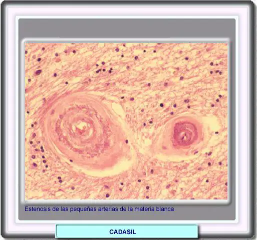 Histológicamente, la enfermedad se caracteriza por un depósito granular eosinofílicoen la media de las pequeñas arterias cerebrales penetrantes, lo que parece ocasionar obliteración vascular y múltiples infartos, sobre todo en la materia blanca, los ganglios basales y la leptomeninges. |