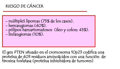 Síndrome de Ruvalcaba-Myhre-Smith El síndrome de Ruvalcaba-Myhre-Smith es una enfermedad hereditaria rara, caracterizada por un crecimiento excesivo previo y posterior al nacimiento, macrocefalia, plagiocefalia escafocefalia, inteligencia normal o retraso mental leve, y crecimientos tumorales benignos preferentemente subcutáneos, similares al hamartoma. Los síntomas de esta enfermedad varían mucho de un caso a otro. En la mayoría de los casos, los niños con el síndrome del Ruvalcaba-Myhre-Smith tienen un peso y talla anormalmente elevados al nacer, retrasándose posteriormente el crecimiento hasta alcanzar la normalidad. Otras manifestaciones de este síndrome son: estrabismo, hipertelorismo, exotropia y pseudopapiledema. Además, los niños afectados pueden presentar hipotonia , babeo excesivo, retraso del desarrollo del habla, y un retraso significativo en la etapas del desarrollo tales como la capacidad de sentarse, de estar de pie, de andar, etc. En algunos casos, pueden existir pólipos a nivel intestinal y, en casos raros, en la faringe y de amígdalas. Otras anomalías adicionales asociadas a esta enfermedad pueden ser cutis marmorata y el desarrollo de "manchas de café con leche" en el pene o en la vulva. En algunos casos, los enfermos también pueden tener anomalías músculoesqueléticas. Se hereda como un rasgo genético autosómico dominante. La enfermedad se debe a una mutación en el cromosoma 10, en un gen llamado PTEN. El riesgo de cáncer en estos pacientes es muy elevado Este síndrome también se conoce como síndrome de Bannayan-Zonana o síndrome de Bannayan-Riley-Ruvalcaba |