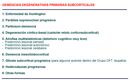Las demencias degenerativas primarias subcorticales más frecuentes son la enfermedad de Huntingdon, el Parkinson con demencia y la parálisis supranuclear progresiva. La degeneración estriato-nigral se incluye dentro del grupo de atrofias multisistémicas La demencia mesolimbocortical tiene todavía una etiopatología poco conocida |