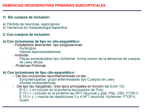 En 1997, Dickson propuso una clasificación bioquímica de las demencias degenerativas primarias basandose en la naturaleza bioquímica de los cuerpos de inclusión que podrían representar diferentes mecanismos de neurodegeneración. Entre los cuerpos de inclusión se pueden distinguir las de tipo no citoesquelético entre las que se incluyen las poliglutaminas, las placas de amiloide del Alzheimer y las de los cuerpos de Lewy. Entre las que muestran inclusiones citoesqueléticas se encuentran las taupatías, que comprenden los trastornos con acumulación de proteínas tau hiperfosforilizadas de forma anormal y las las sinucleinopatías. |