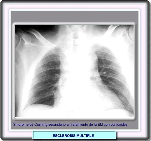 Reacciones adversas de las medicaciones utilizadas en la esclerosis mútiple Los fármacos más utilizados en el tratamiento de la esclerosis múltiple (interferones y glatirámero) suelen ser bastante bien tolerados y presentan reacciones adversas ligeras. Por el contrario, los corticoides, que se utilizan frecuentemente para tratar los brotes agudos, pueden presentar serios efectos adversos, como este síndrome de Cushing en un paciente tratado con prednisona