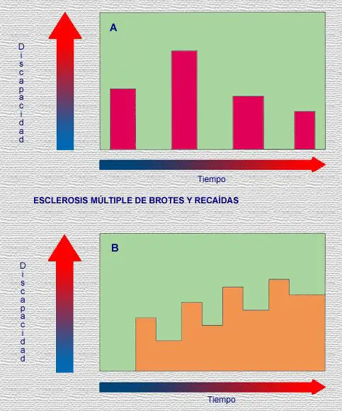 Se caracteriza por ataques agudos con completa recuperación entre los brotes (A) o con secuelas y déficit neurológico progresivo después de cada ataque (B)